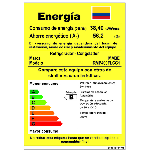 Ahorra hasta un 56% de energía acreditada en la etiqueta RETIQ. Eficiencia tipo B, producto de menor consumo esto se verá reflejado en el recibo mensual de energía.