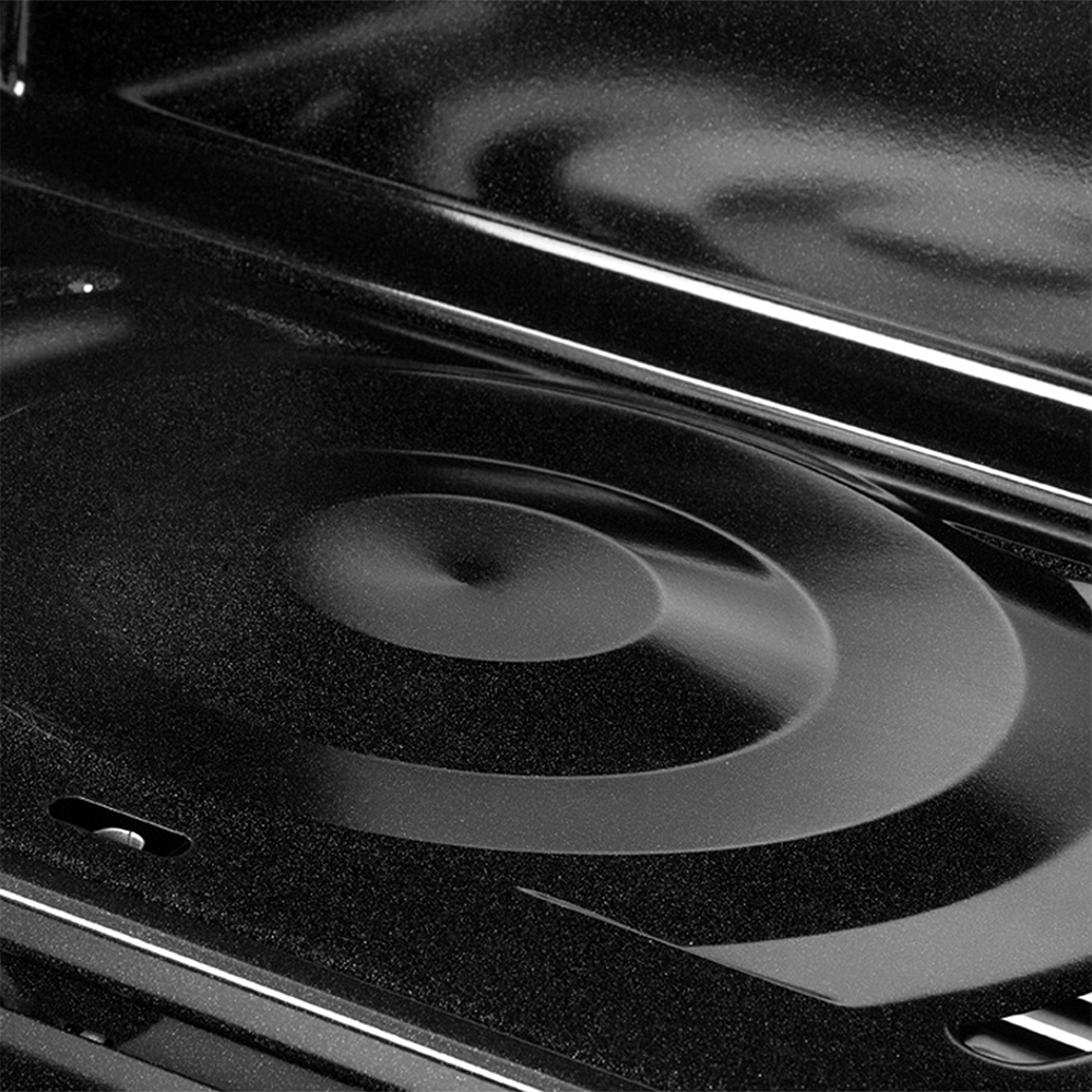 Acabado cerámico liso, poco poroso, que recubre la cavidad del horno. Su mínima rugosidad evita que la suciedad se adhiera con fuerza dentro del horno. Un poco de agua en las manchas al terminar la cocción, permite una fácil limpieza.