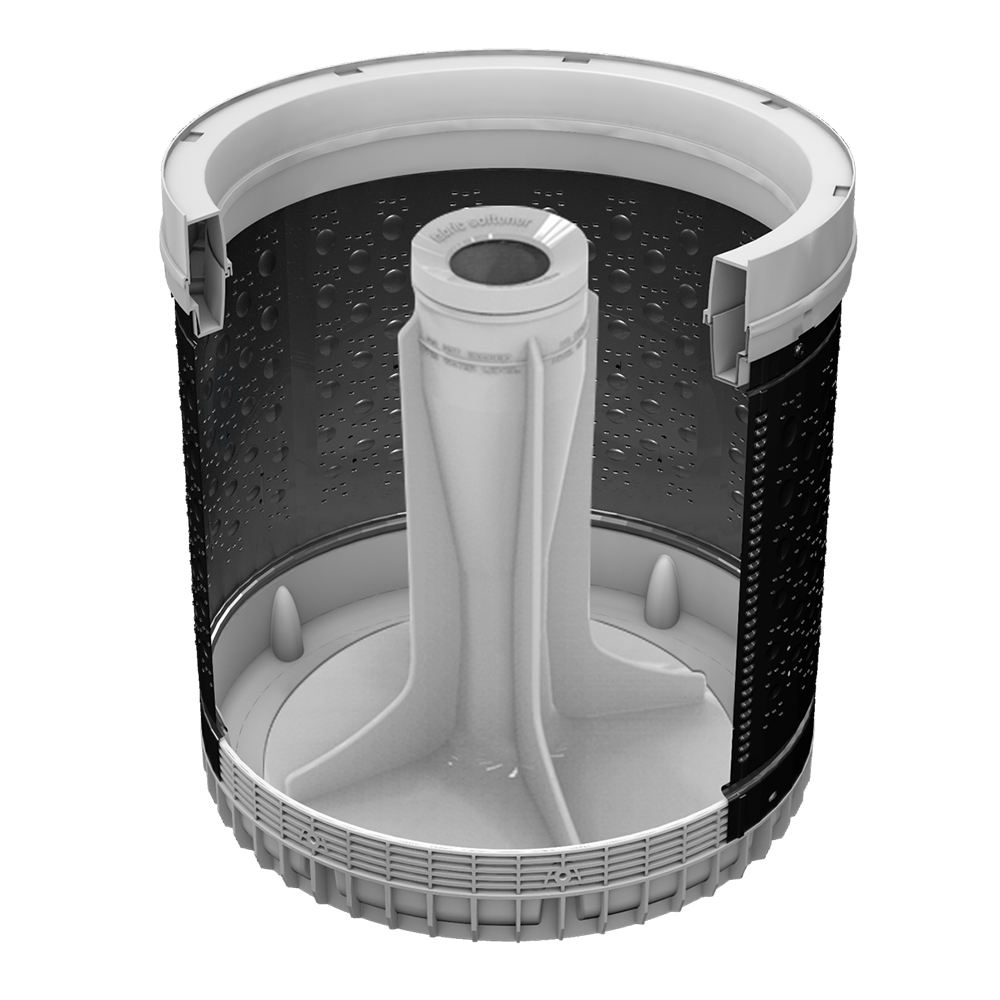 De acero inoxidable y máxima capadidad. El diseño de la canasta ayuda a una mayor salida de agua y pronto secado de la ropa. Balance de la tina para evitar que pegue o se cargue hacia un lado por el peso de la ropa.
