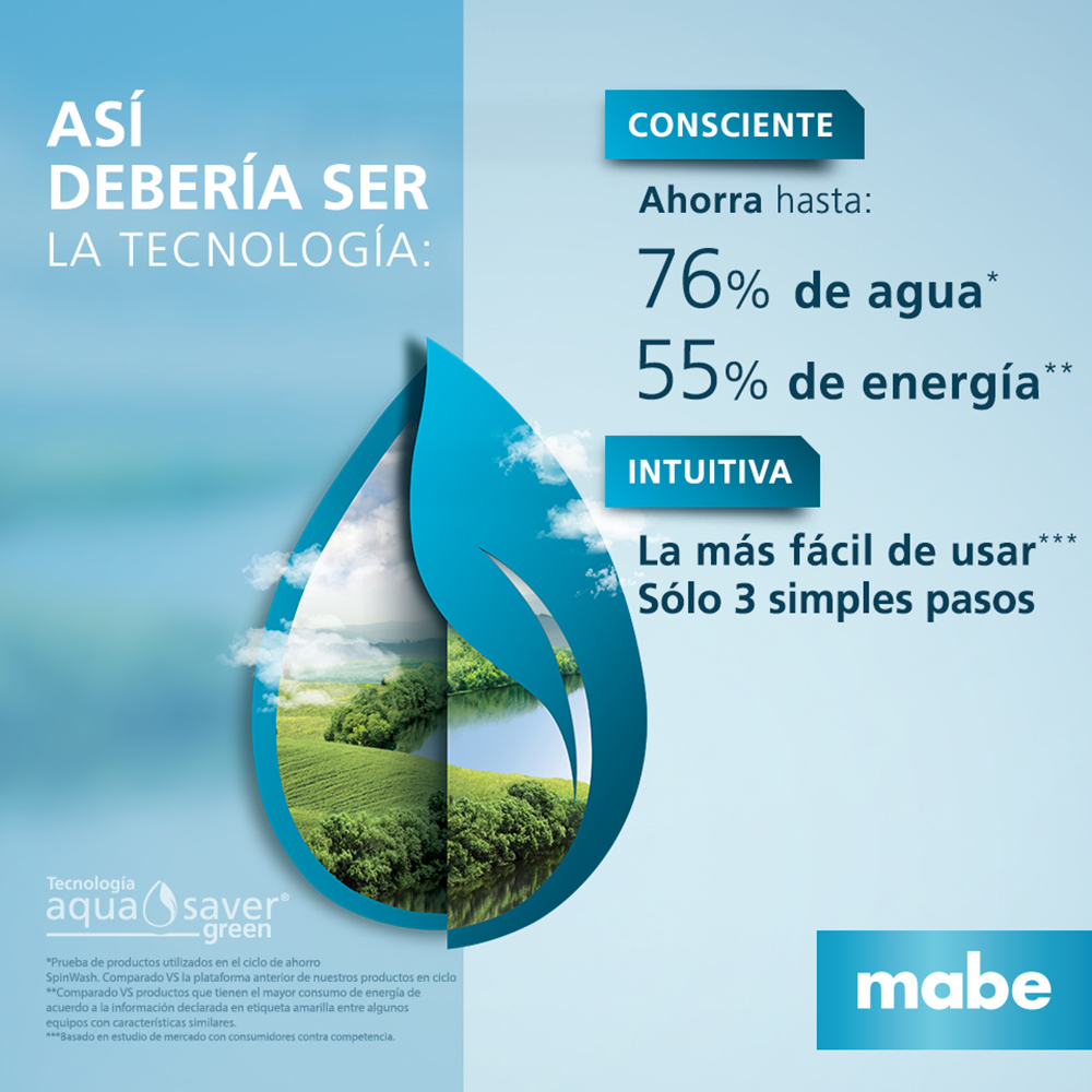 Así debería ser la Tecnología: CONSCIENTE Ahorra hasta un 76% de agua por lavada*. *Ahorro comprado contra nuestras lavadoras automáticas. Ahorra hasta 55% de energía*.*Contra capacidades comparables. INTUITIVA La más fácil de usar*.