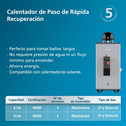 Calentador de Paso Rápida Recuperación Mabe 6 L/min DP-06 1 servicio Gas LP - CRM06SLP