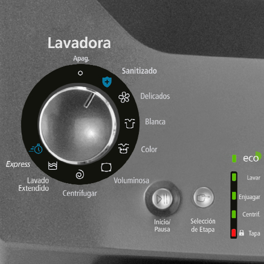 Cuenta con programas 7 ciclos de lavado automáticos. Sanitizado, Delicados, Blanca, Color, Voluminosa, Centrifugar, Lavado, Extendido y Express.