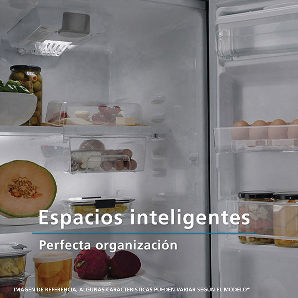Organiza sus alimentos en los 3 niveles de cristal templado al interior, 4 compartimientos en puerta, 3 niveles con bandejas de cristal templado al interior del congelador y 3 compartimientos en puerta.