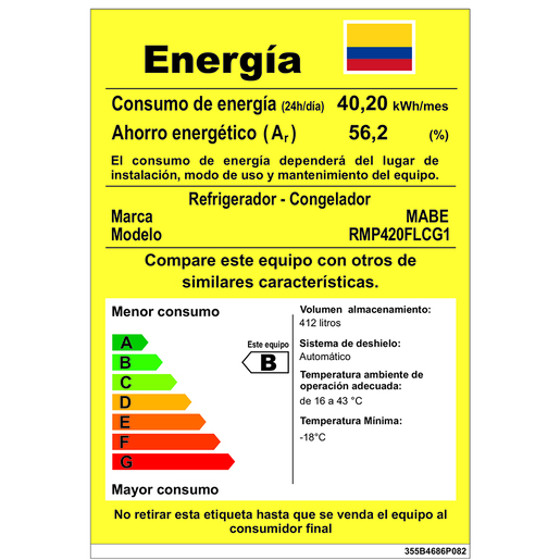 Ahorra hasta un 56% de energía acreditada en la etiqueta RETIQ. Eficiencia tipo B, producto de menor consumo esto se verá reflejado en el recibo mensual de energía.